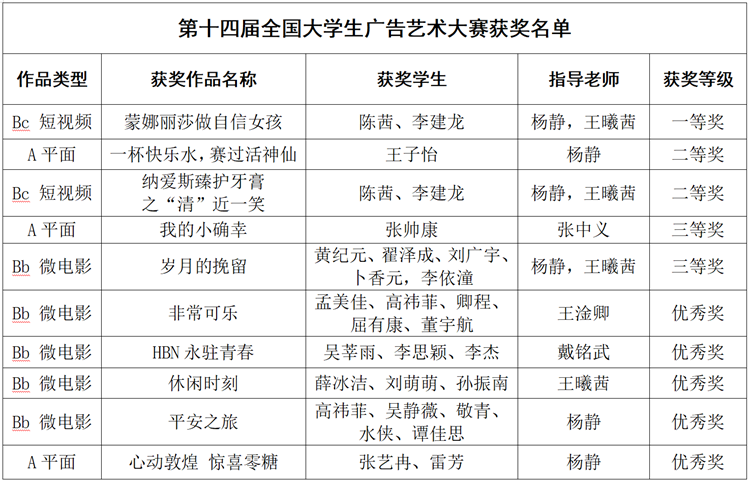 12月15日,第14届全国老员工广告艺术大赛(以下简称“大广赛”)全国总评审获奖名单揭晓,竞赛成果展示云盛典在北京成功举办。本届大赛全国共1869所高校踊跃参赛,170万余名老员工积极提交创意作品。公司学子不负众望,分别在平面设计、微电影广告视频、短视频等赛道中奋勇拼搏,共计有10项参赛作品荣获本届“大广赛”陕西赛区大奖,其中一等奖1项、二等奖2项、三等奖2项、优秀奖5项,获奖总数再创新高。