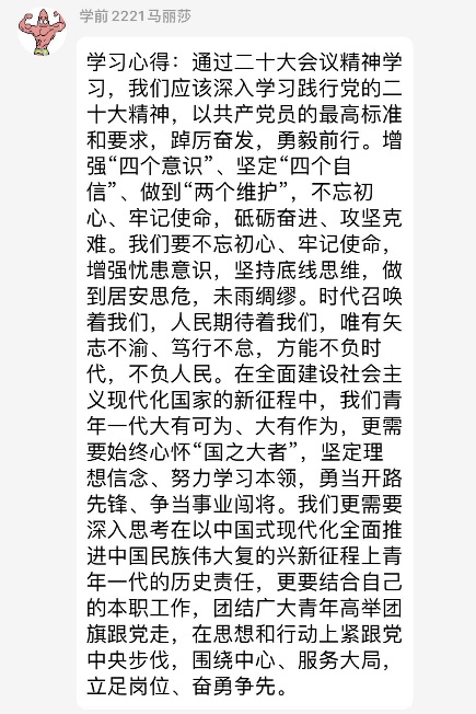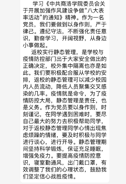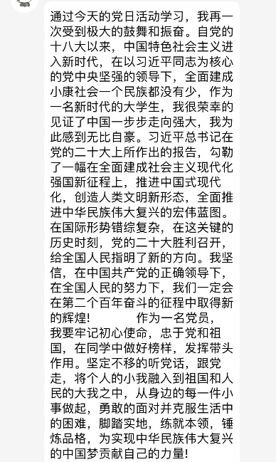 党员同志李宸裕表示:“我们身为党员就应该坚持中国共产党的领导,将党的二十大精神落实到平时的工作和学习中去。在公司的静态管理期间,坚持落实好防疫相关政策,遵守纪律,服从安排,提高站位;同时关注身边同学的情绪,营造正能量的校园氛围,关心同学的困难,及时与同学沟通,帮助他们排解不良情绪,克服困难”。