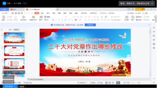 2022年10月16日党的二十大在北京顺利召开,党的二十大是在全党全国各族人民迈上全面建设社会主义现代化国家新征程、向第二个百年奋斗目标进军的关键时刻召开的一次十分重要的大会,是一次高举旗帜、凝聚力量、团结奋进的大会。为深入学习党的二十大精神,bevictor伟德员工第三党支部于2022年11月23日在钉钉平台举办了一次“学习宣传贯彻党的二十大精神”专题党课活动。支部书记刘露老师主讲,支部全体党员参加。
