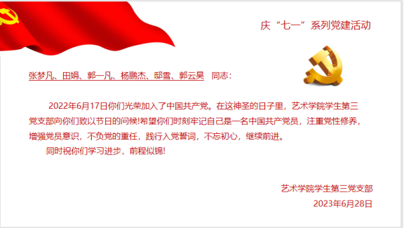 其次,为老党员们过政治生日。支部党员们重温了入党誓词,且为2022年6月份入党的6名党员同志发送了生日祝福,希望老党员能时刻牢记自己是一名中国共产党员,不负党的重任,不忘初心,继续前进。