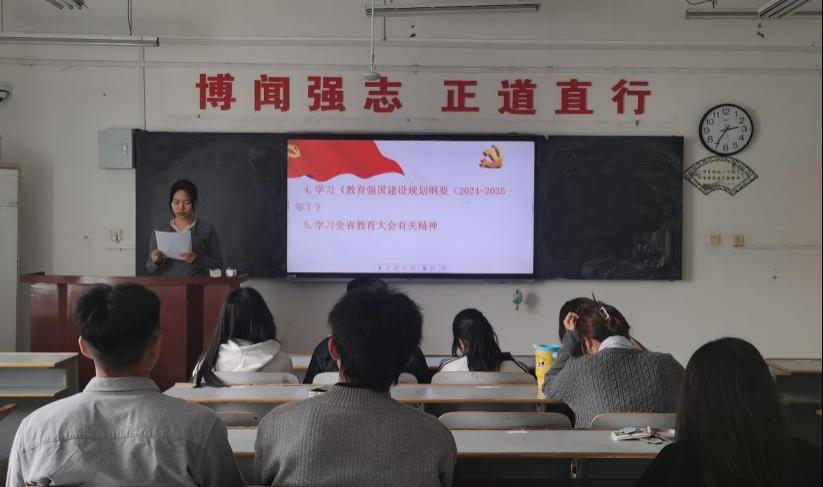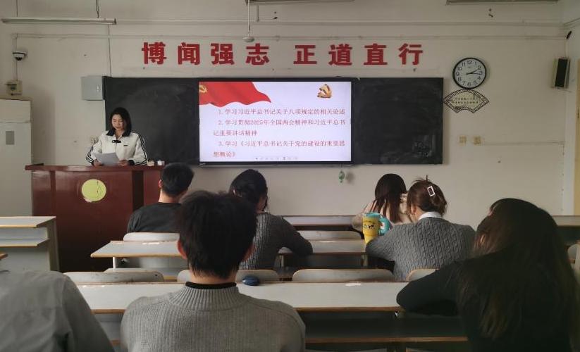会上,李沛桐首先带领党支部党员学习习近平总书记关于八项规定的相关论述,文章指出,必须发扬党的优良作风,持之以恒落实中央八项规定精神,以好作风好形象创造新伟业。接着晏睿、黄笑、崔雪丽三位同学带领大家分别学习贯彻2025年全国两会精神、习近平总书记重要讲话精神以及《习近平总书记关于党的建设的重要思想概论》;刘慧、梁秋芳二位同学分别带领大家学习《教育强国建设规划纲要(2024-2035年)》和全省教育大会有关精神等相关内容。