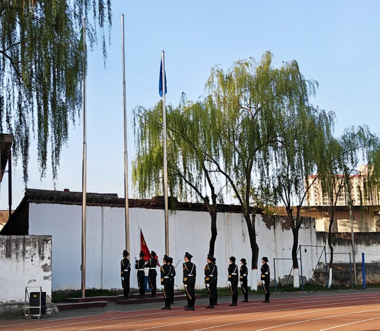 伴随清晨阳光抛洒,7:10升旗仪式正式开始。英姿飒爽的国旗护卫队们护送着鲜艳的五星红旗进场。伴随着庄严的《中华人民共和国国歌》,五星红旗冉冉升起,迎风飘扬。在场的师生们向国旗行注目礼,凝聚对祖国的无限热爱和崇高敬意。