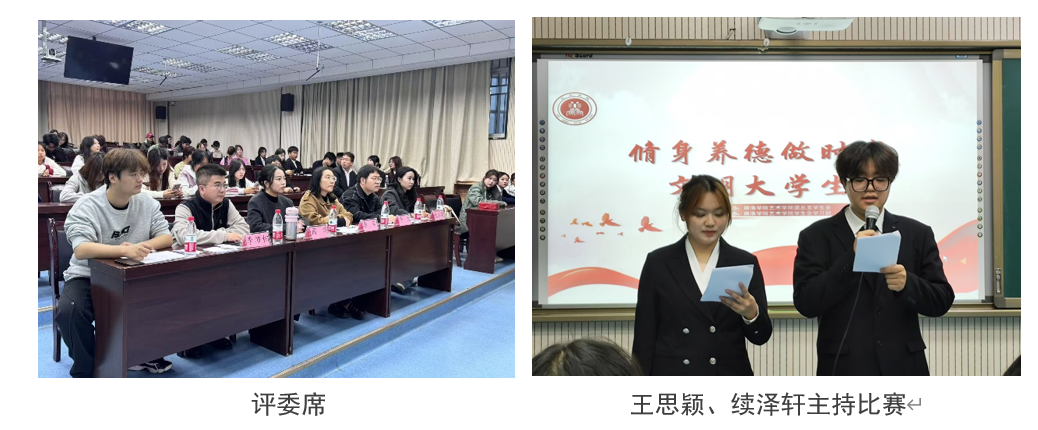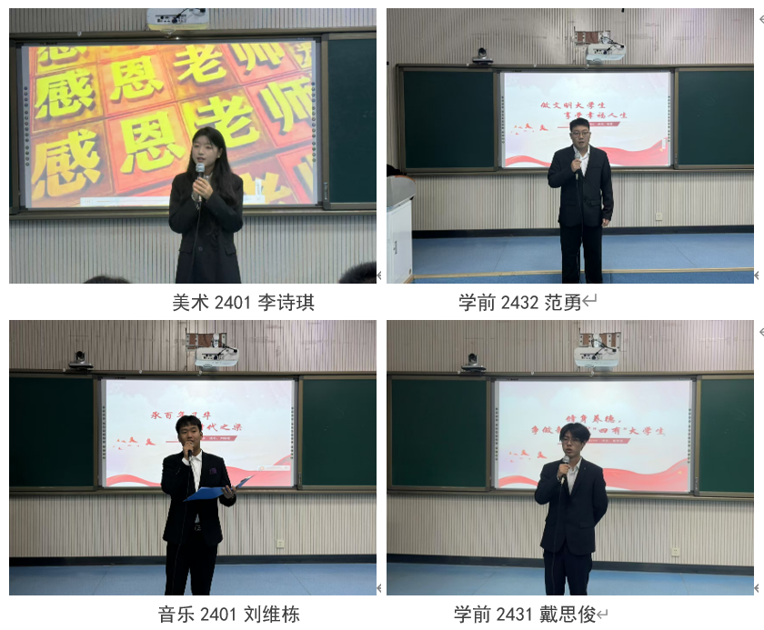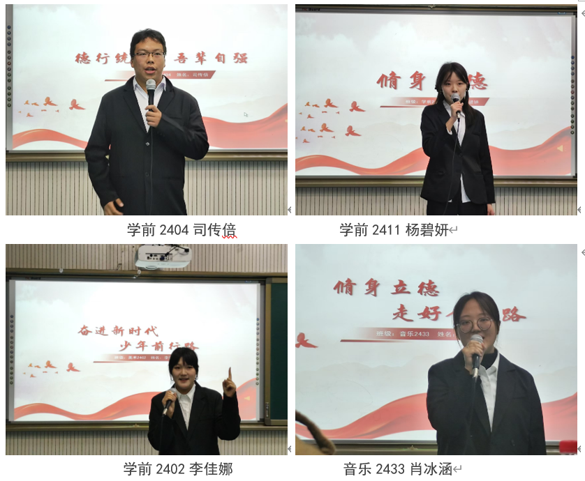 晋级决赛的8名员工(学前2404司传倍、学前2411杨碧妍、学前2402李佳娜、音乐2433肖冰涵、美术2401李诗琪、学前2432范勇、音乐2401刘维栋、学前2431戴思俊)依次上台演讲。他们回溯往昔,展望未来,结合老员工活和个人言行,从不同角度阐述了修身养德的重要意义。他们以激动高昂的情绪、抑扬顿挫的旋律、生动形象的演绎,表达了个人立德修身的决心和勇担使命的抱负。他们身上散发的正能量,感染着现场所有的师生观众。肖冰涵、李佳娜、李诗琪获得三甲。