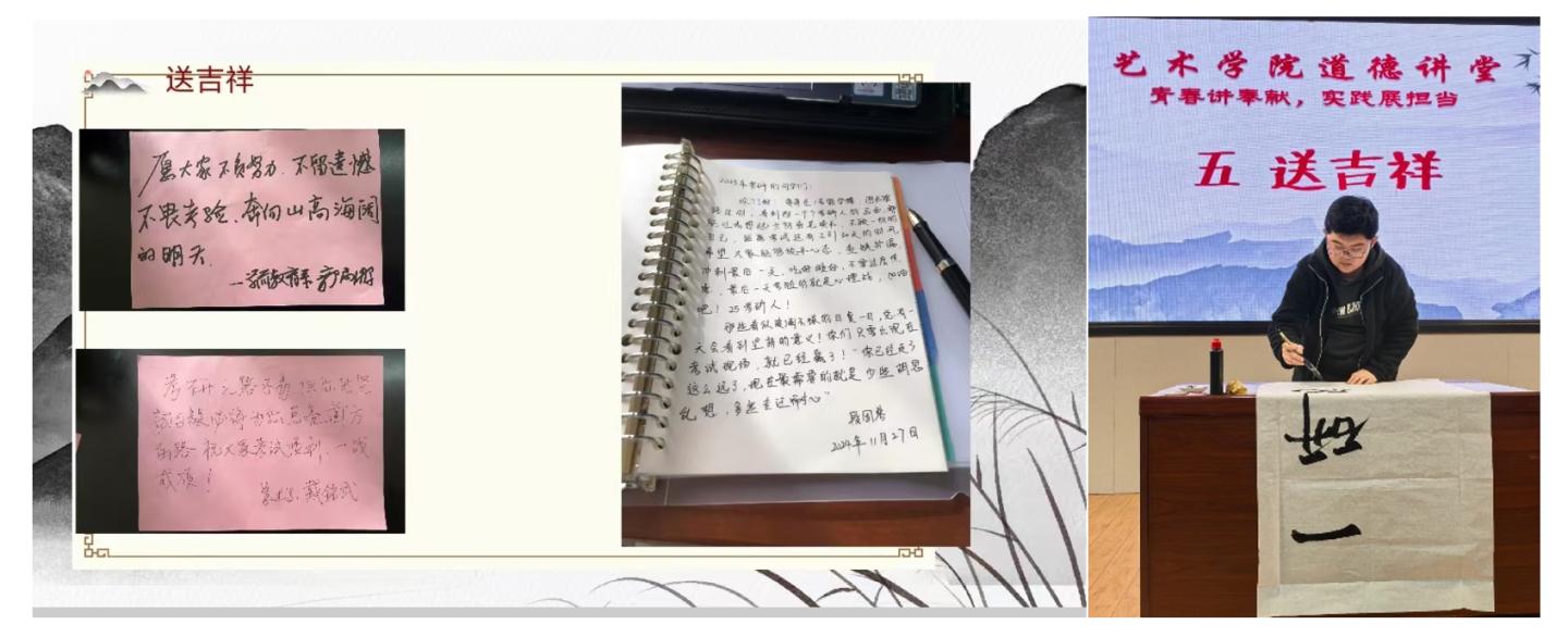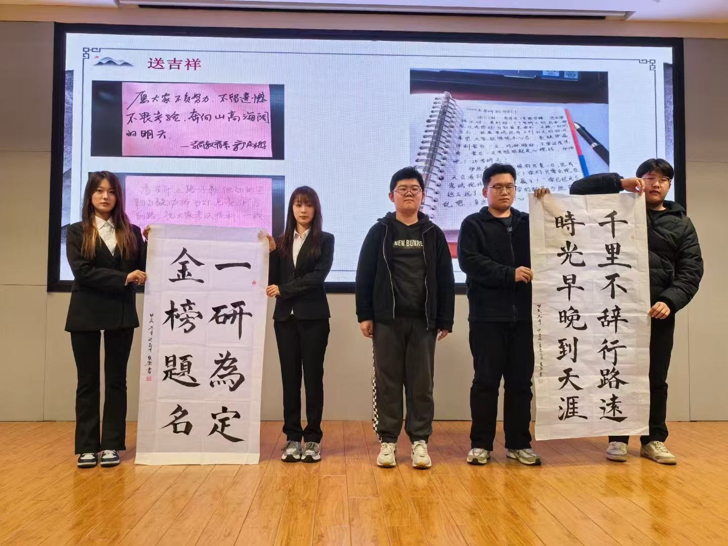 “送吉祥”环节,美术2204韩胜乐同学用以书法为现场师生和考研员工送祝福。同时,bevictor伟德三位系主任也鼓励考研员工在复习的最后关头坚定信心,祝愿大家一“战”成“硕”。