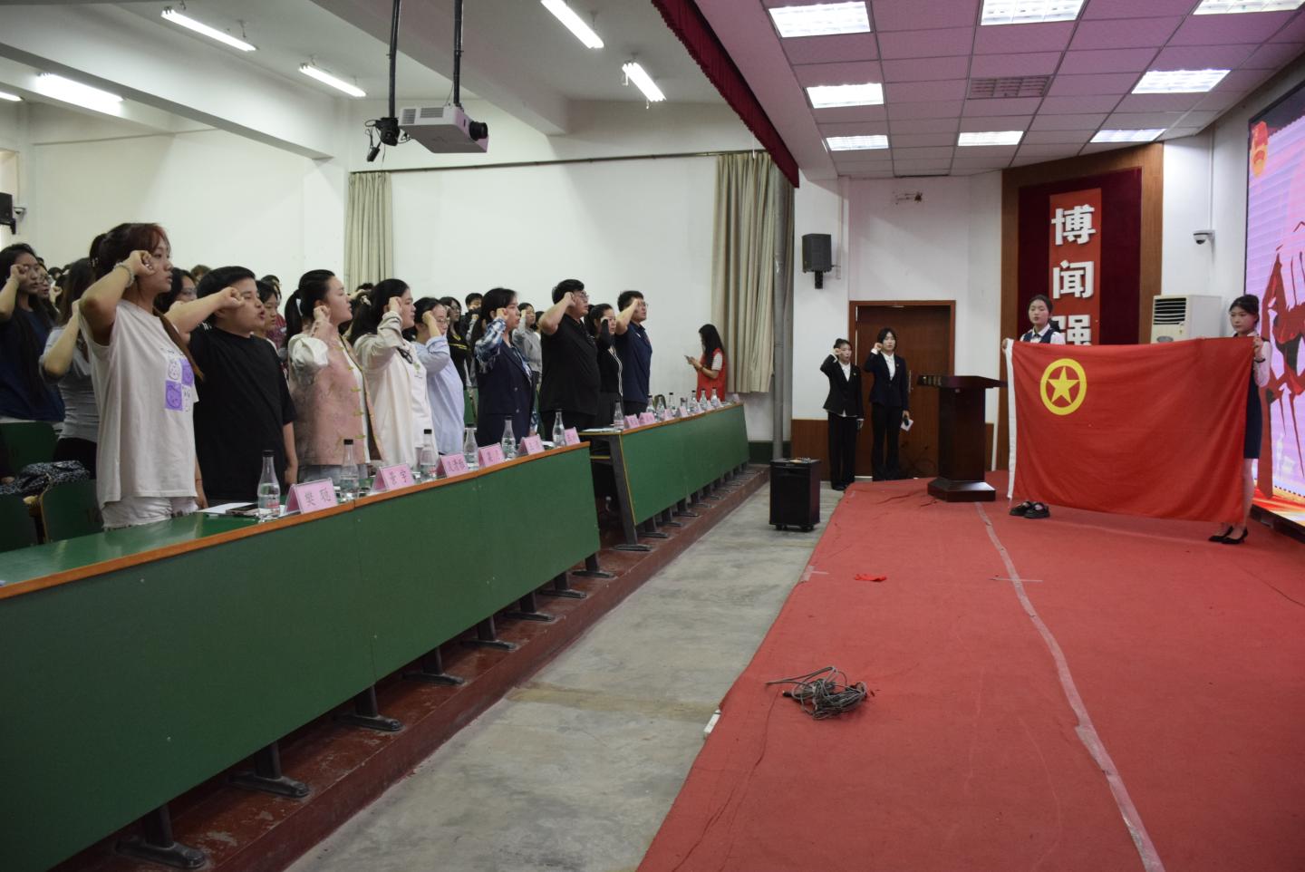 活动在庄严的团歌声中拉开序幕。200余名师生齐声高唱《光荣啊,中国共青团》,铿锵有力的旋律回响在会场。
