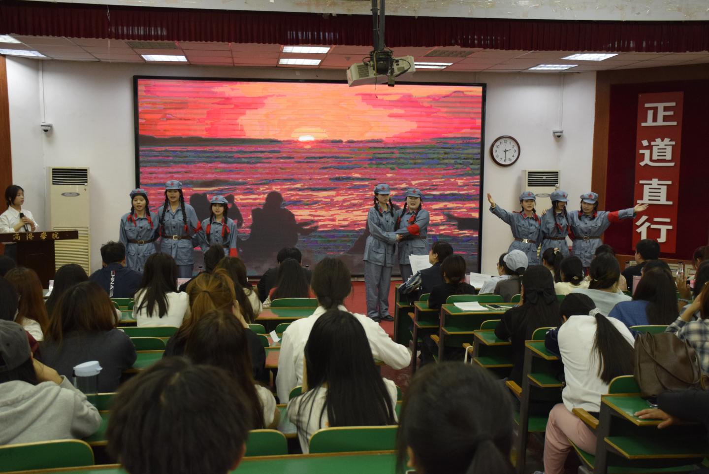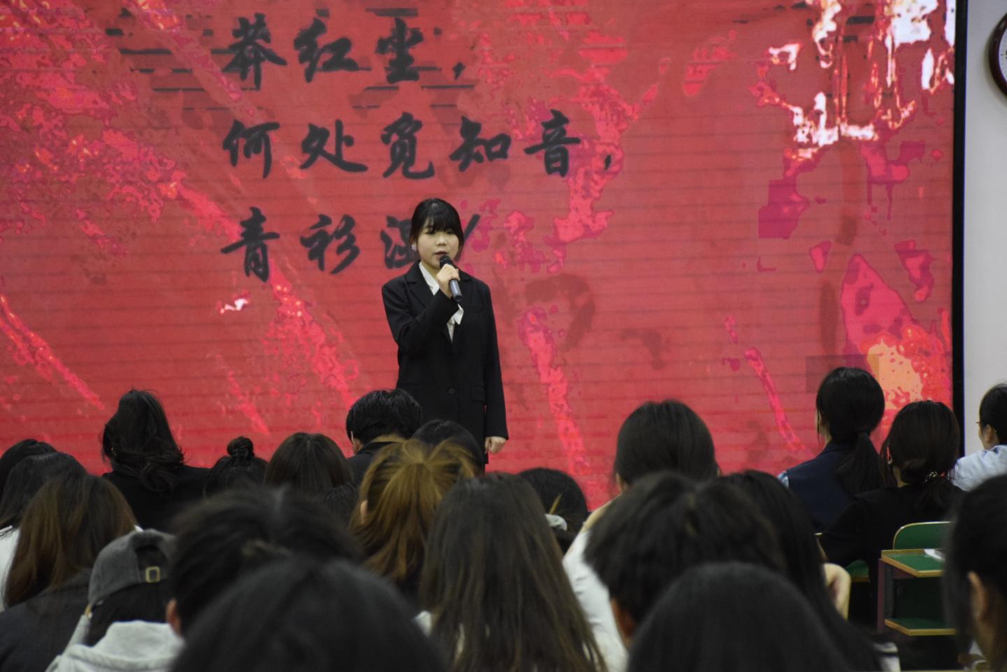 沉浸式学习环节,学前2311班的刘金花、雷佳音等4名团员演绎了革命夫妻陈觉和赵云霄的故事,陈觉临刑前给妻子的诀别信,赵云霄留给襁褓女儿的泣血嘱托,共同谱写出共产党人最炽热的精神基因图谱;学前2301班李思煜、惠霞等3名团员通过情景剧《“瑾”花一笑明千秋》,演绎了近代中国第一位为革命献身的女性秋瑾的故事。学前2311班刘诗琪、樊玲玲等9同学演绎了情景剧《八女投江》,通过艺术化创作,再现了冷云等抗联女战士挽臂涉入乌斯浑河的壮烈场景。学前2301班冀辰瑶、钟慧等4同学深情诵读了赵一曼就义前写给儿子的绝笔信。现场师生无不动容,将对革命先烈的敬仰化作阵阵掌声。