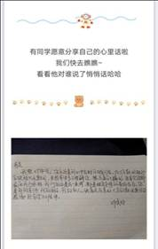 本次活动从四月拉开帷幕,班级心理委员经过观察和调研,根据班情学情自定形式,开展“同学我想对你说”主题班会、茶话会;“老师我想对你说”明信片、树洞倾诉;“爸爸妈妈我想对你说”亲情电话、感恩消息等,鼓励老员工将自己的心里话表露出来,释放压力和情绪。活动过程人人参与,起到了舒缓内在消极压力、提振积极向上活力的预期目标。
