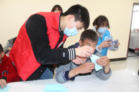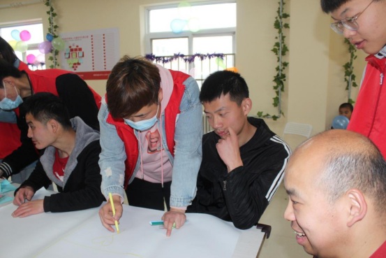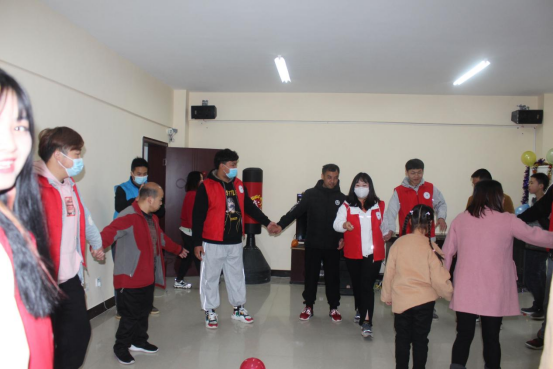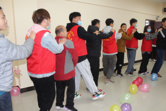 志愿者们与他们共同进行“排火车”的互动游戏,轻松有趣的游戏让他们的脸上洋溢着幸福的笑容。