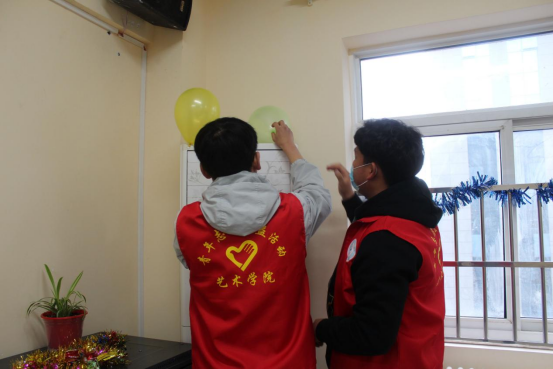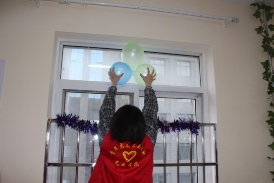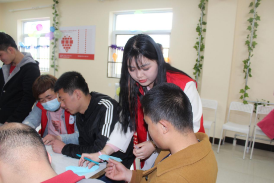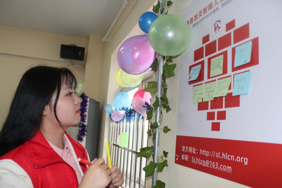 第二个环节是“系蓝丝带,送上祝福”,蓝丝带代表了感恩、鼓励、关怀和爱,志愿者们为他们系上蓝丝带,并在便利贴上写下鼓励的话语。