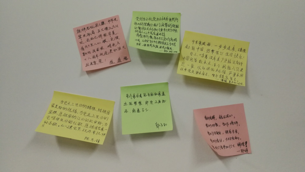 7月1日,恰逢支部8名党员被接收为预备党员不久,支部特举办此次“政治生日”活动,首先,由党员代表诵读“不忘初心,牢记使命”学习教育内容。其次,通过重温入党誓词,让大家思想上再一次经受洗礼,强化党性意识。随后,所有人在卡片上写出生日寄语,希望自己朝着优秀共产党员的方向不断前进,也祝福党的未来不断发展壮大,灿烂辉煌。最后,刘钰同志勉励所有党员,希望通过此次“政治生日”活动,大家的理想信念更加坚定,言行举止更加规范,把党员身份始终放在第一位,做一名合格党员。