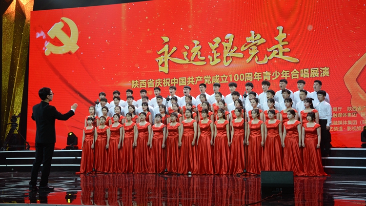 陕西省庆祝中国共产党成立100周年“永远跟党走”青少年合唱展演活动,由陕西省教育厅、陕西省广播电视局、陕西广电融媒体集团联合主办,旨在坚持以社会主义核心价值观为引领,坚持根植中华优秀传统文化深厚土壤,坚持以美育人、以美化人、以美培元,引导员工树立共产主义远大理想和中国特色社会主义共同理想,增强员工的中国特色社会主义道路自信、理论自信、制度自信、文化自信,立志肩负起民族复兴的时代重任,培养德智体美劳全面发展的社会主义建设者和接班人,以优异成绩向中国共产党成立100周年献礼。活动共收到全省120余所大、中、小学推荐报送的参演作品,其中高等公司约60所,11所高校获得了陕西广播电视台现场录制及展演,并将在陕西广电融媒体集团(陕西广播电视台)公共文艺频道进行播出。
