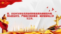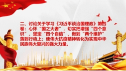 活动第二项内容,带领党员对会前安排自主学习《习近平谈治国理政》第四卷内容开展讨论,并结合个人实际进行交流总结,了解支部党员的学习是否落实好了会前提出的“深刻领会其蕴含的丰富内涵、精神实质、实践要求”等基本目标。